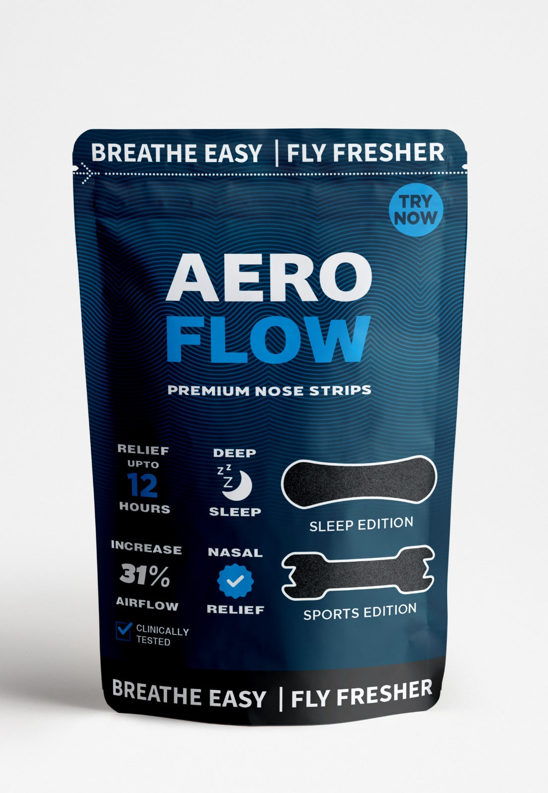 AeroFlow Nasal Strips gently open your nasal passages to deliver deeper airflow, helping you stay calm, clear, and in control—whether you're powering through the day or sleeping through the night. Designed with next-gen flex springs and skin-safe adhesive, they stay in place through marathons, workouts, and restful sleep.